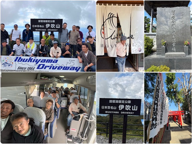 豊田市駅前に集合して出発しましたが、高速道路に入って僅か30分で事故渋滞に巻き込まれ、1時間以上足止めされてしまいましたが、運転手さんの提案もあり、行き先の順番を変えて、まずタオル工房で高級タオルを各々買い物し、その後関ヶ原方面に向かい昼食で美味しい近江牛のコースを頂きました。その後伊吹山山頂へ行き山頂周辺は気温15℃とかなりひんやりする程でした。そして眼下に広がる美しい琵琶湖を背景に集合写真を撮りました。